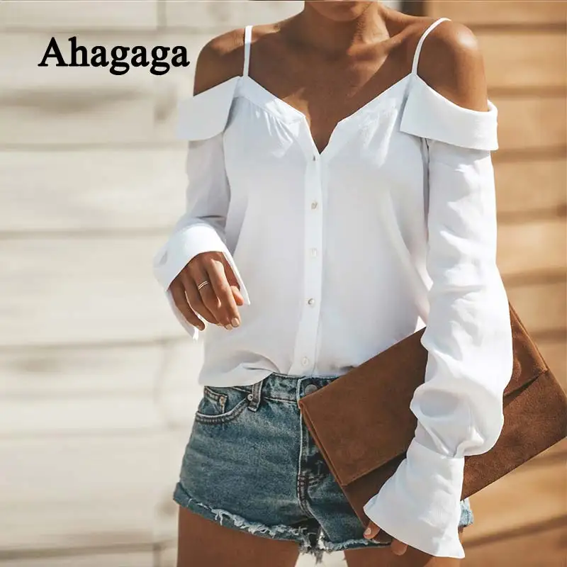 price cut 2019 Autumn Casual Blouse Women Tops Fashion Solid White Black Button Slash Neck Regular Long Sleev