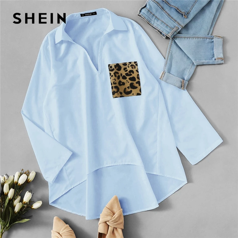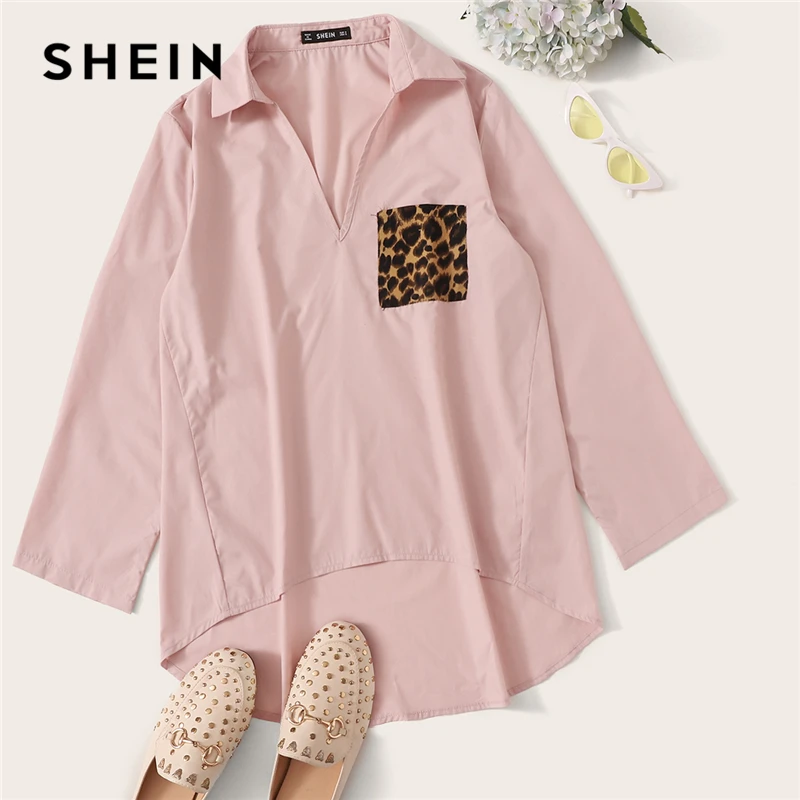 Finest SHEIN Patched Leopard Pocket Dip Hem Blouse Women Clothes 2019 Spring Casual Long Sleeve Ladies Top