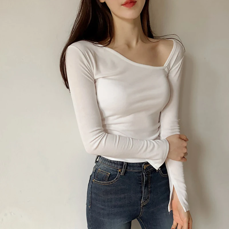 astounding shintimes White Long Sleeve T Shirt Women Sexy Black Tops Tshirt Womens Poleras Mujer 2019 T-Shirt