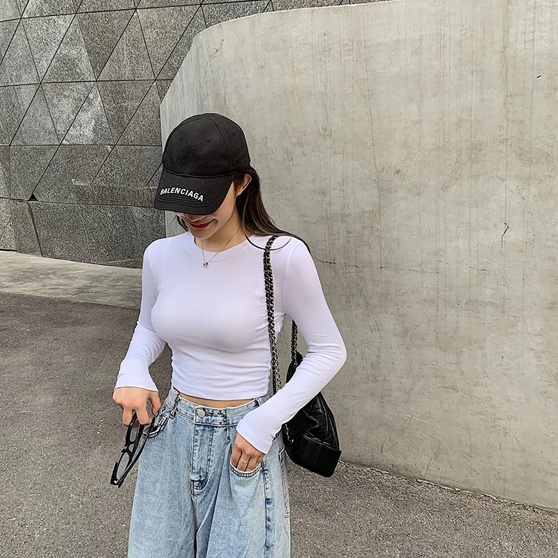price cut Women O-neck Cropped T-shirts Girls Full Sleeve Sheath Thin Tshirt Basic Crop Tops For Female GR210