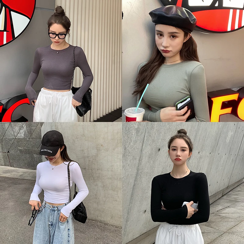 Promo Women O-neck Cropped T-shirts Girls Full Sleeve Sheath Thin Tshirt Basic Crop Tops For Female GR210